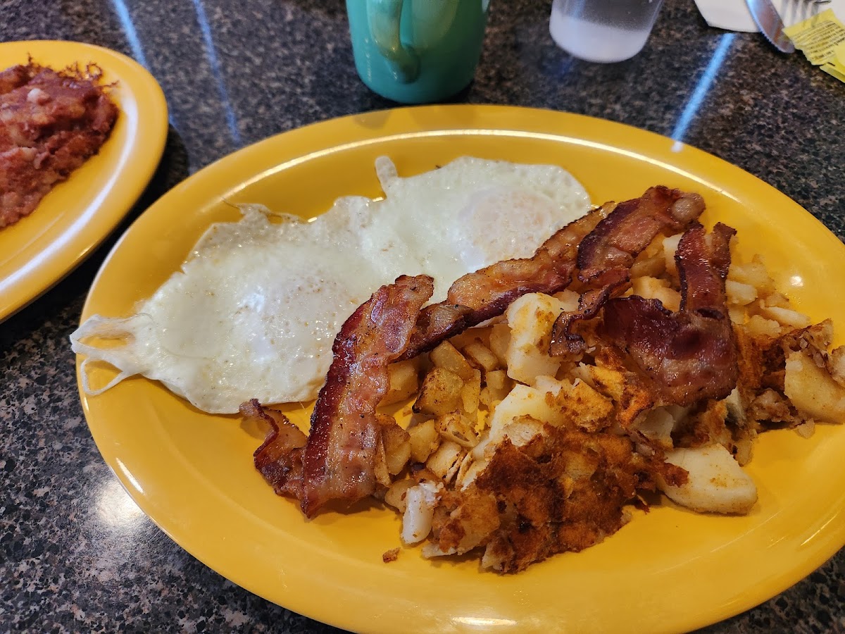Great place, A shiny metal diner with a small jukebox at each table. Truly a 1950s to 1960s feel, it's really a cool, feel-good kind of place. Great place for breakfast, 2 eggs, choice of meat, choice of potatoes, toast, and coffee for $8.99, alot of food for a good price. The place for a true bottomless cup of coffee. Highly recommend stopping here to eat. It's worth the drive or the detour. I can ensure you won't be disappointed.
